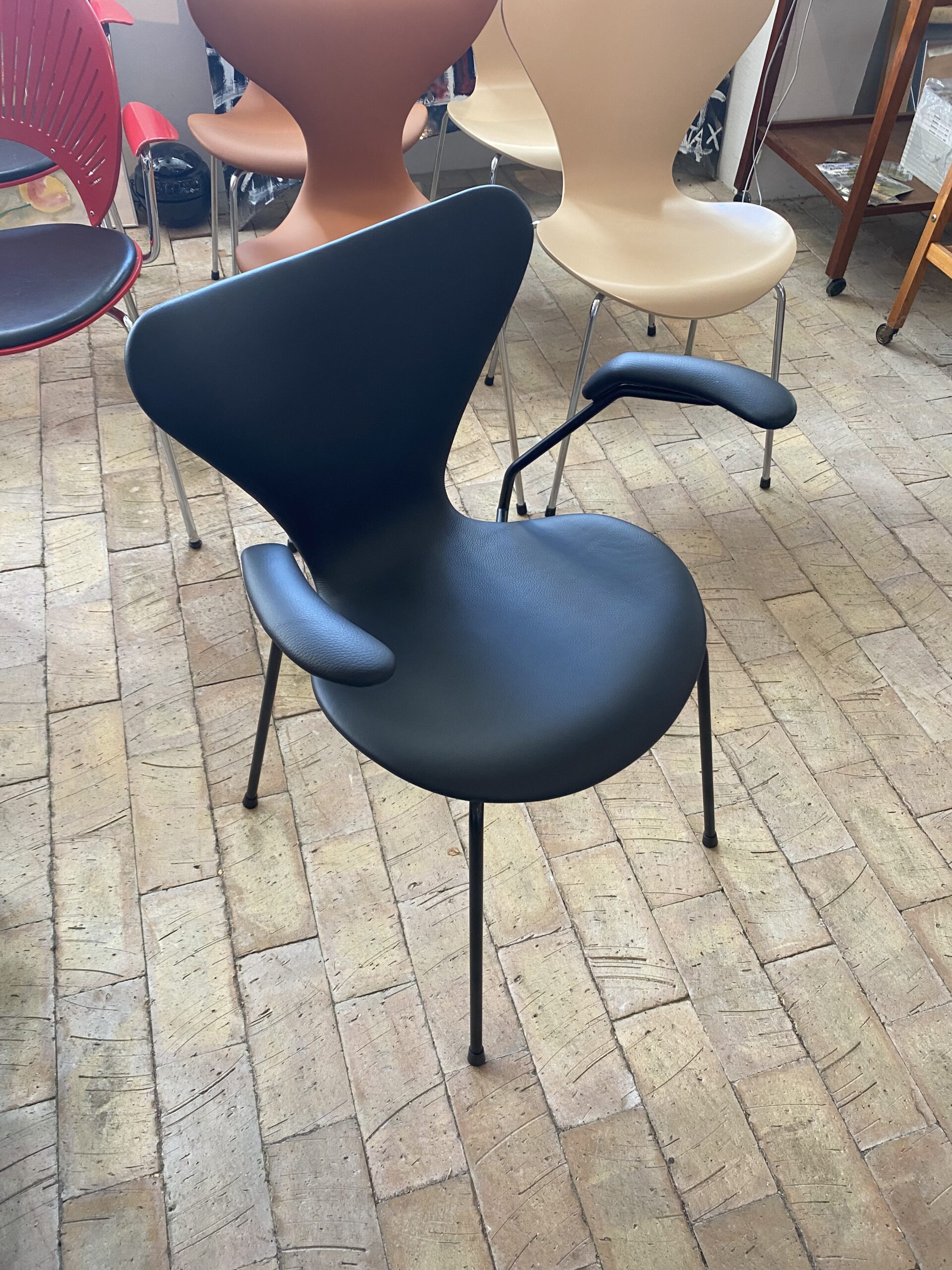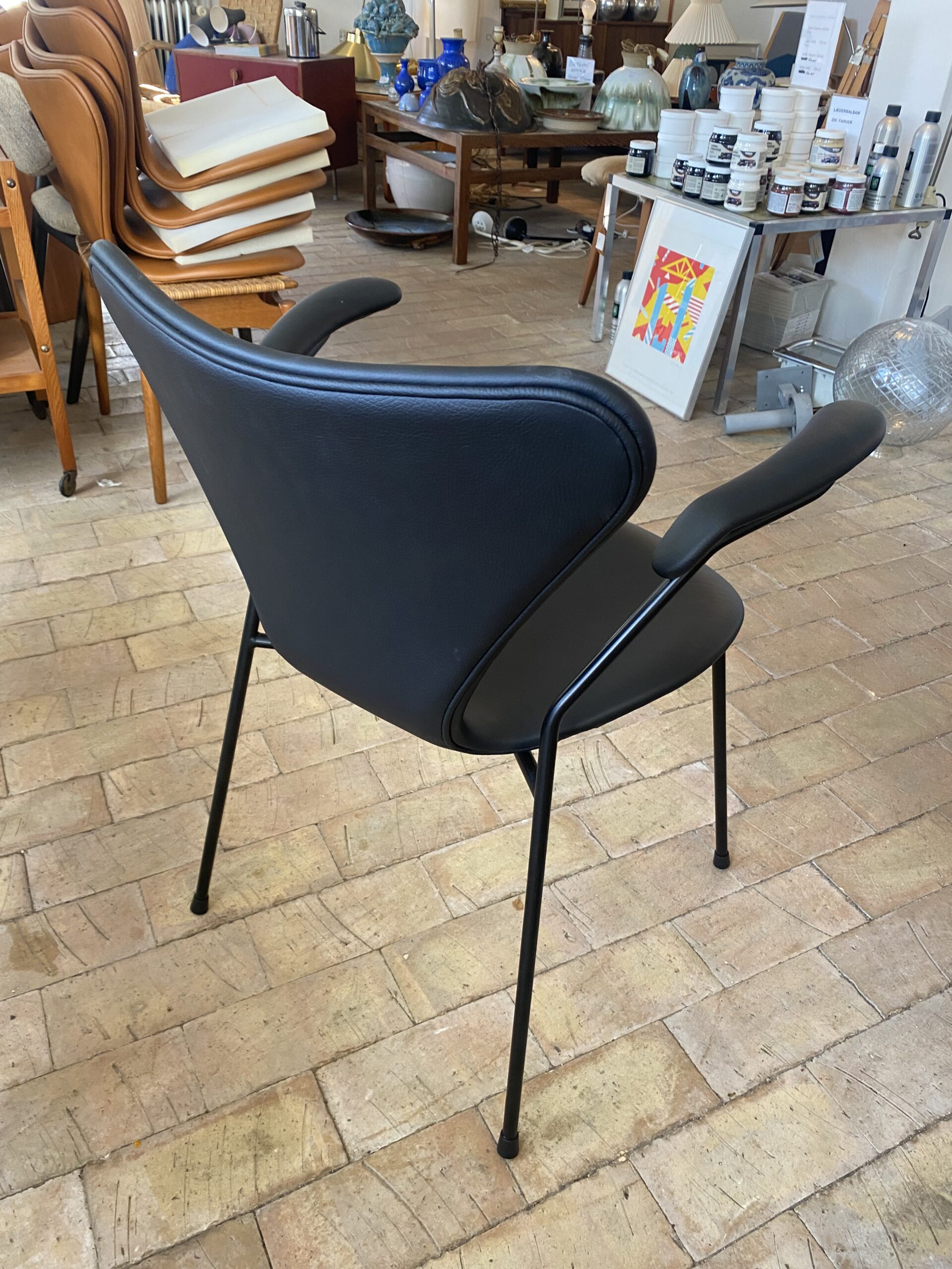 Arne Jacobsen syver stol, Nypolstret i sort Klassik læder. Denne stol har fået malet stel i sort og benforhøjet til nyere siddehøjde.