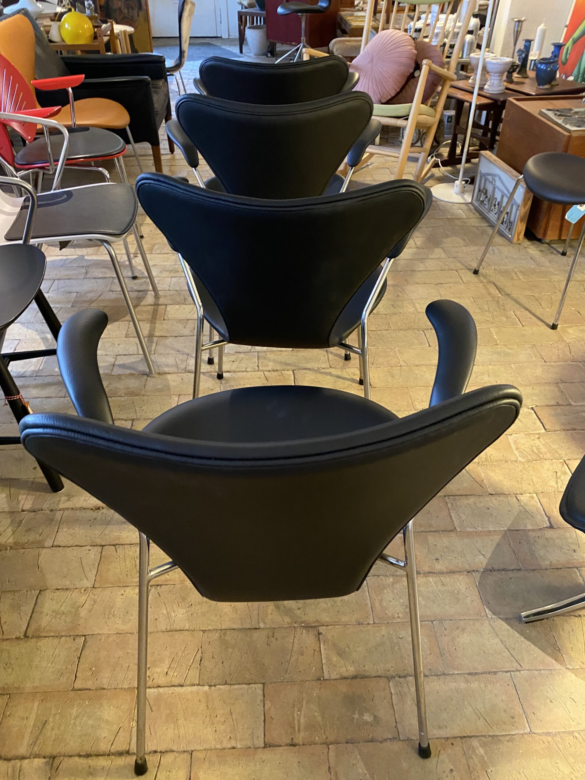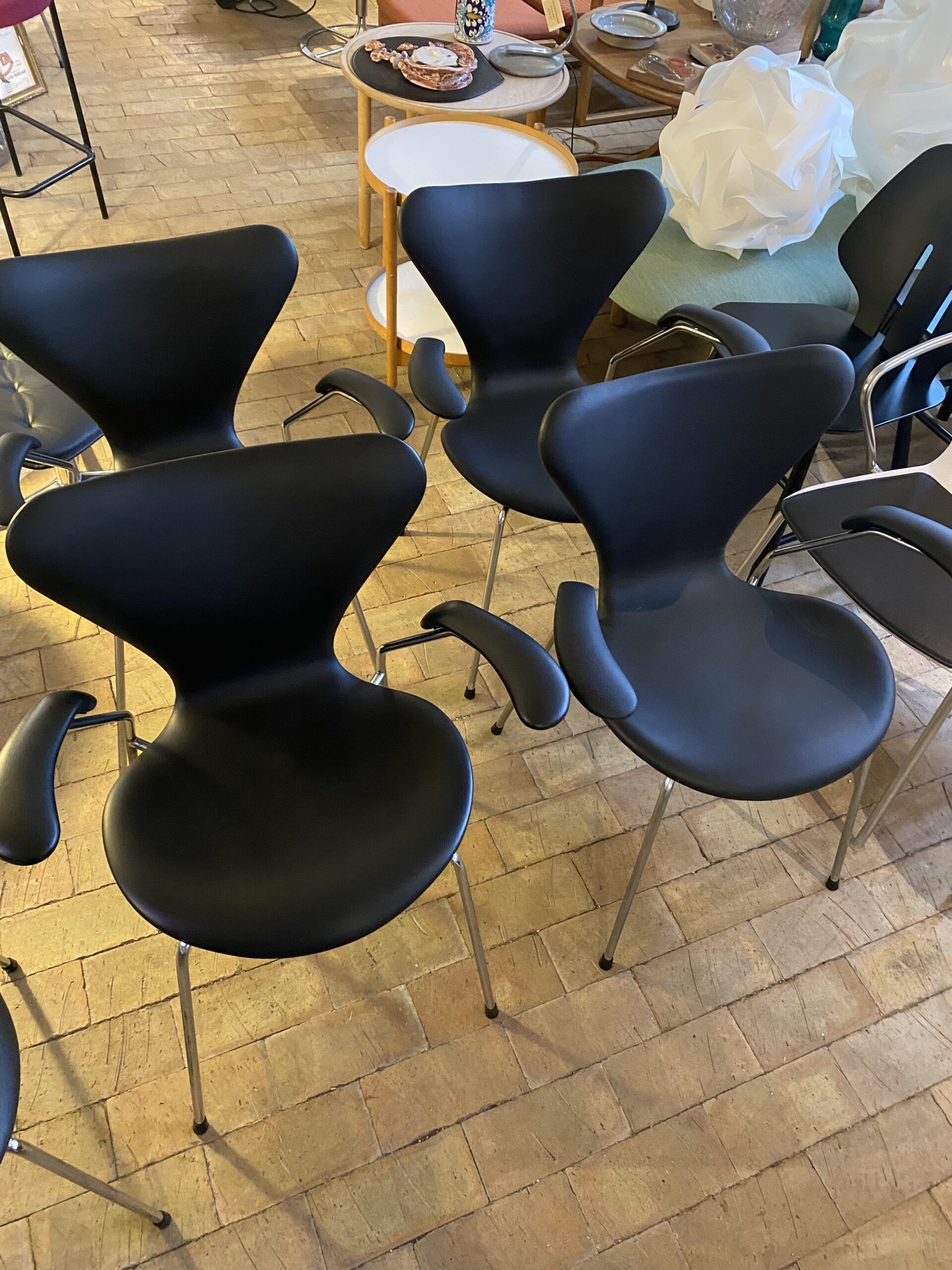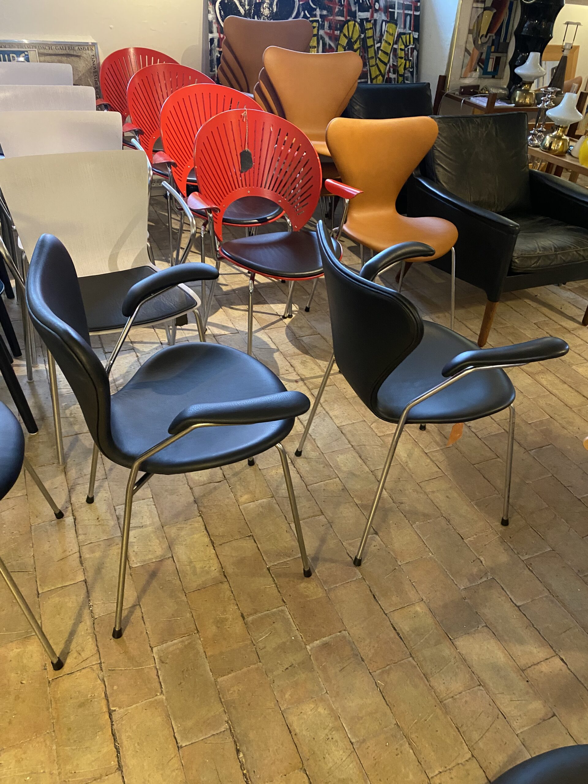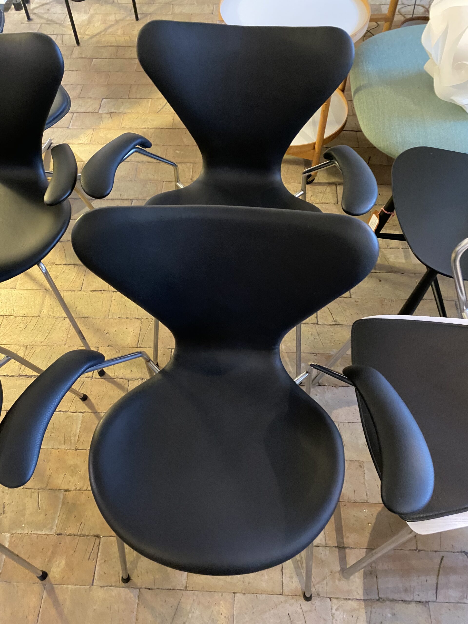 Ny polstrede Arne Jacobsen stole med armlæn, model 3207 Polstret i sort klassisk læder. De er benforhøjet så de har fået ny højde.
