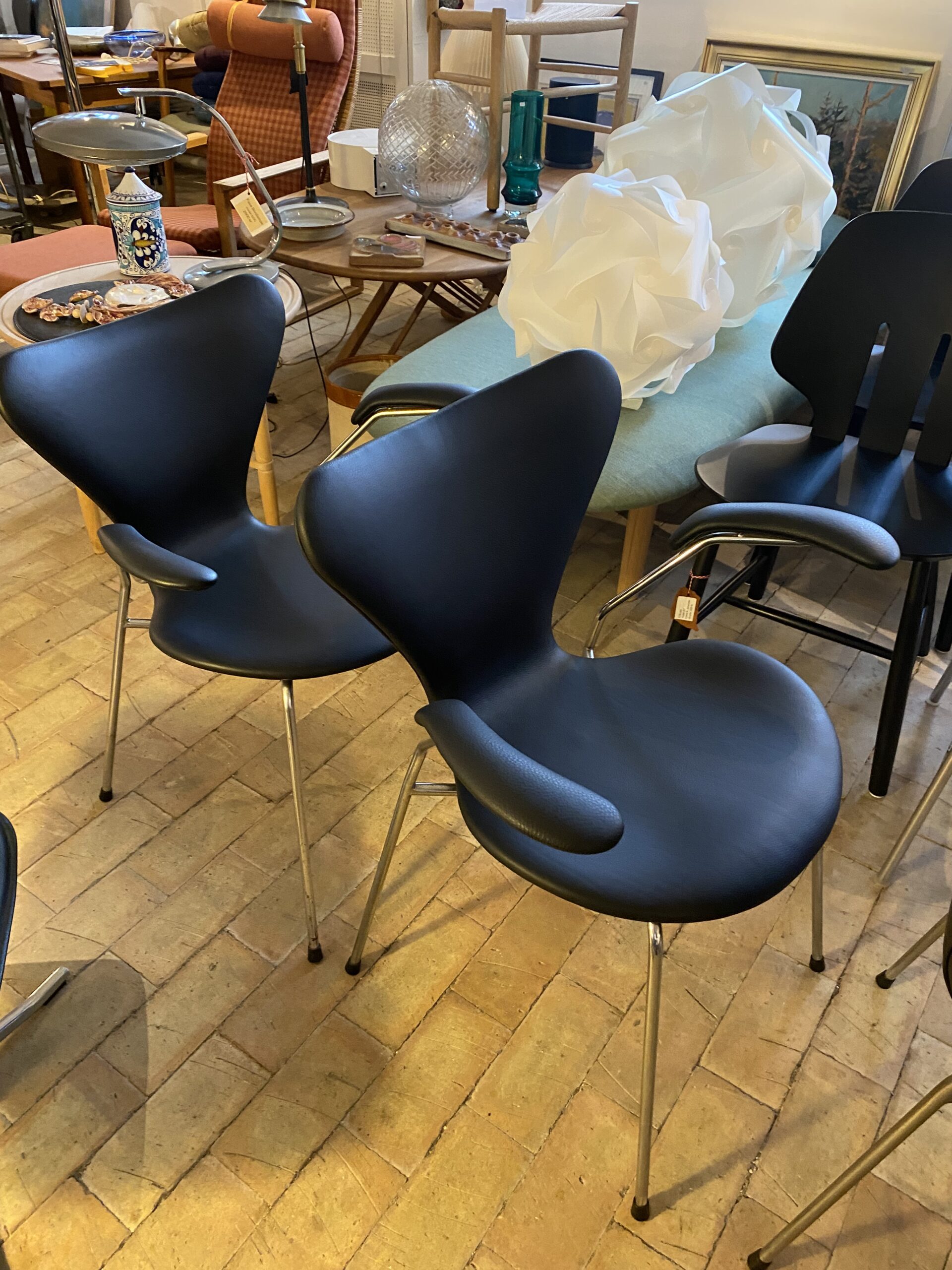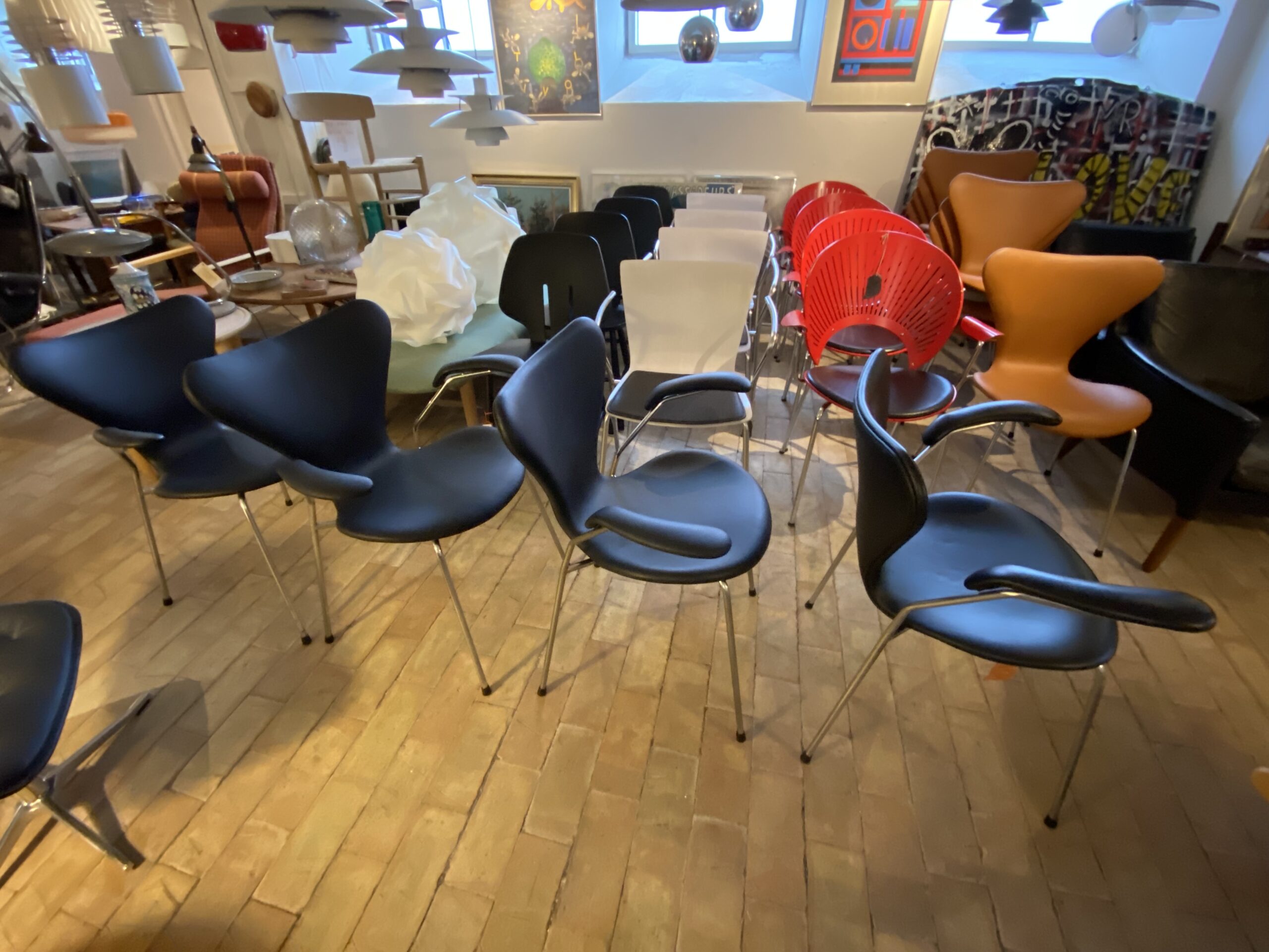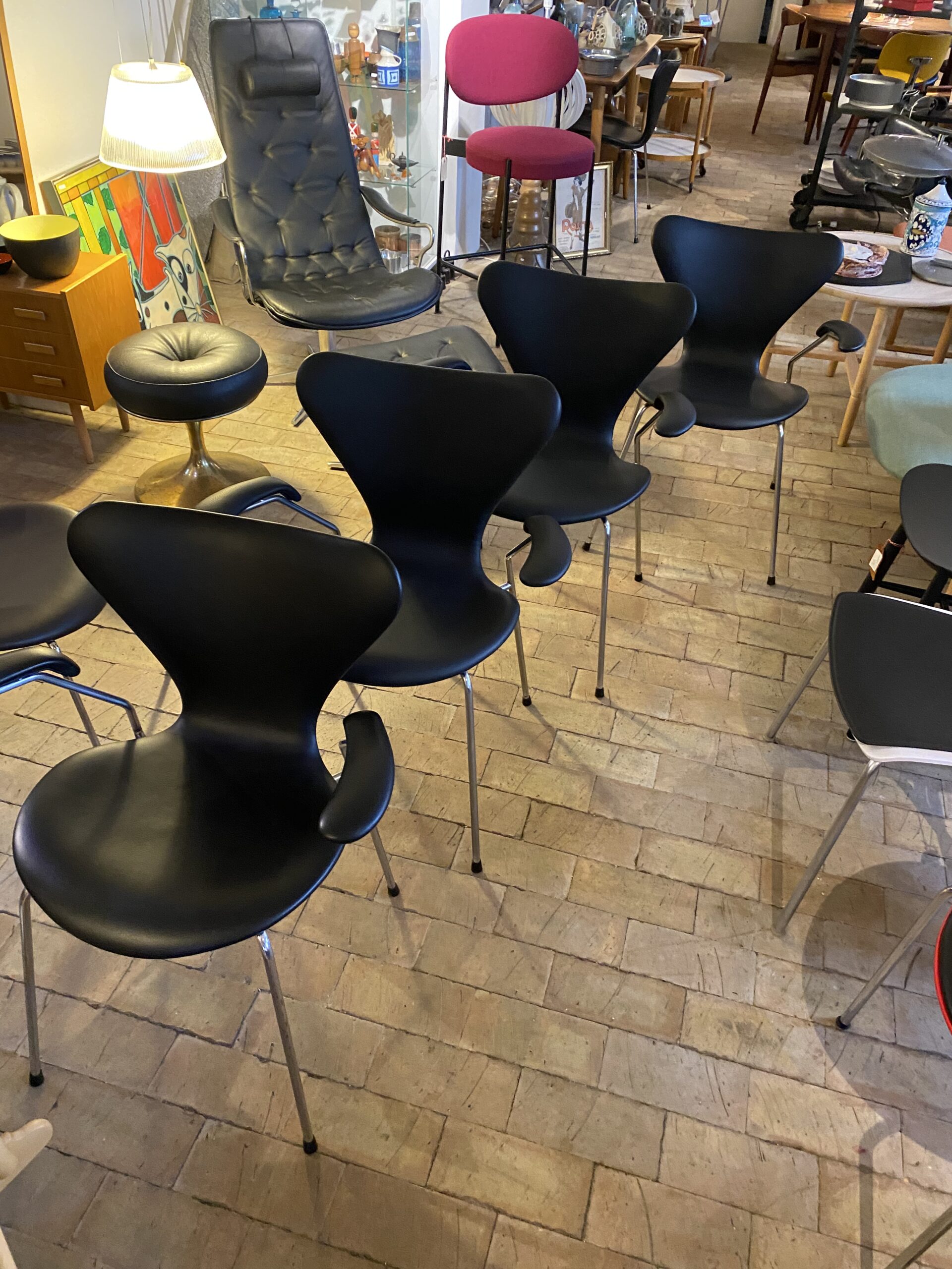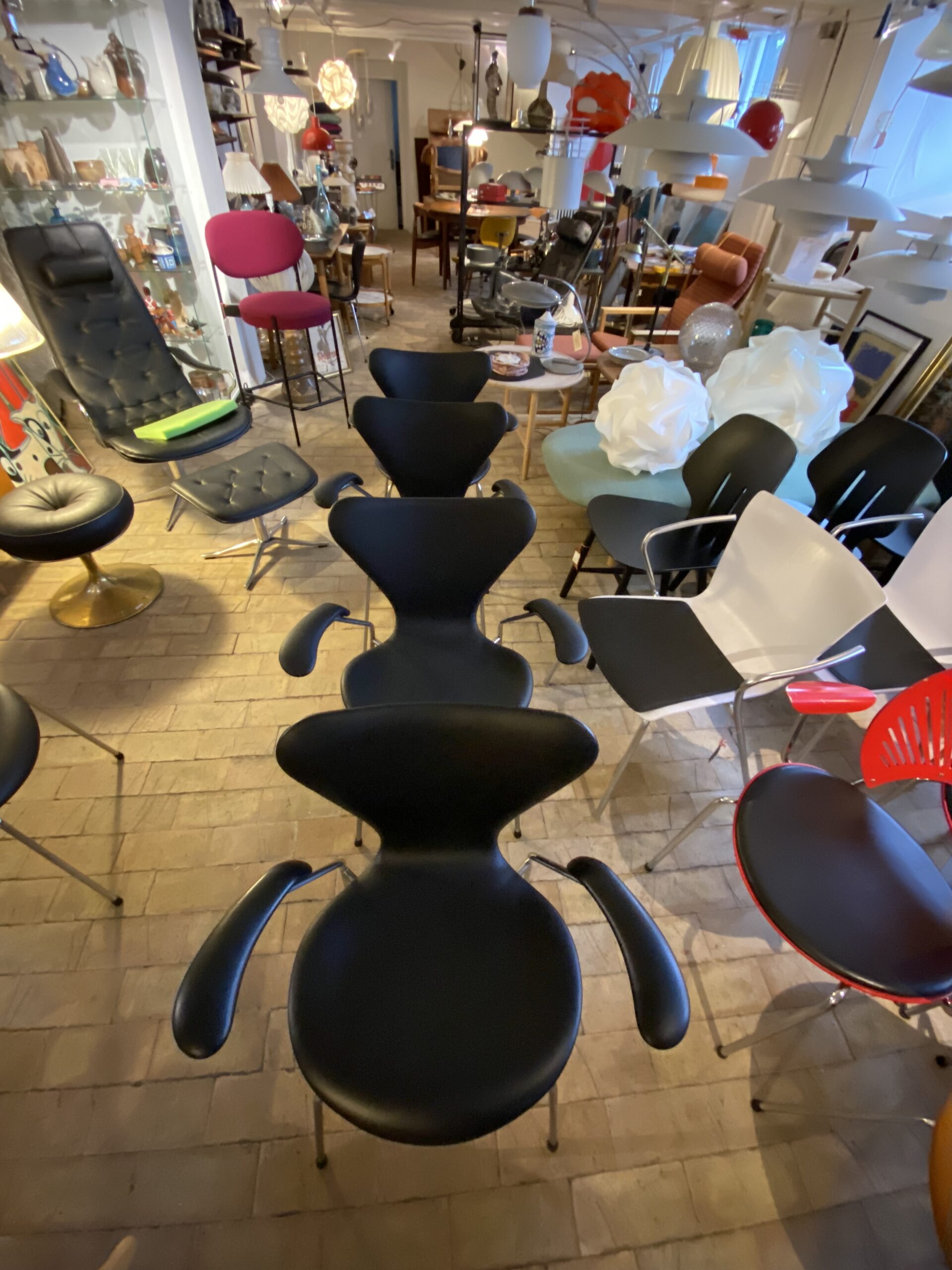 Ny polstrede Arne Jacobsen stole med armlæn, model 3207 Polstret i sort klassisk læder. De er benforhøjet så de har fået ny højde.