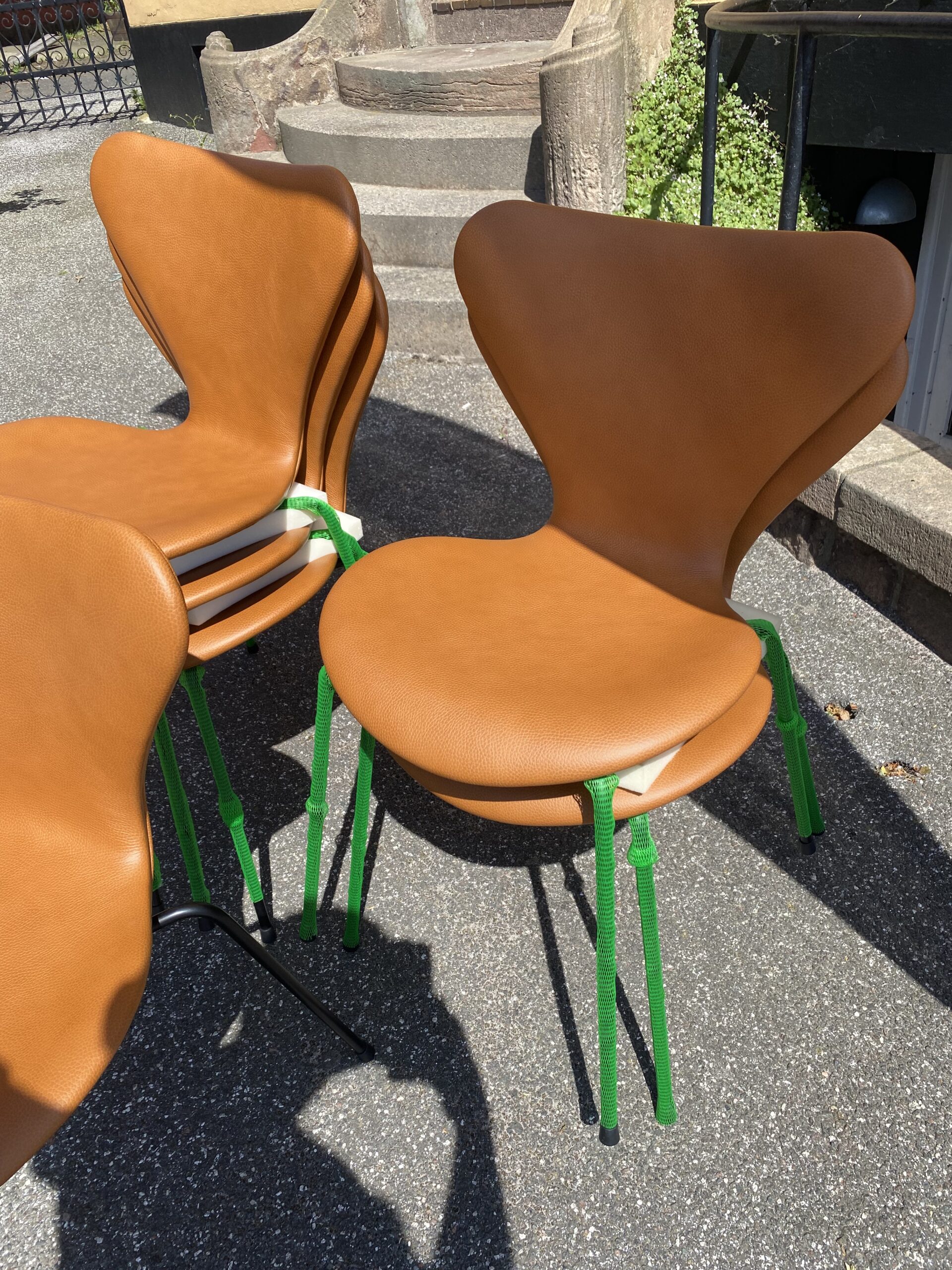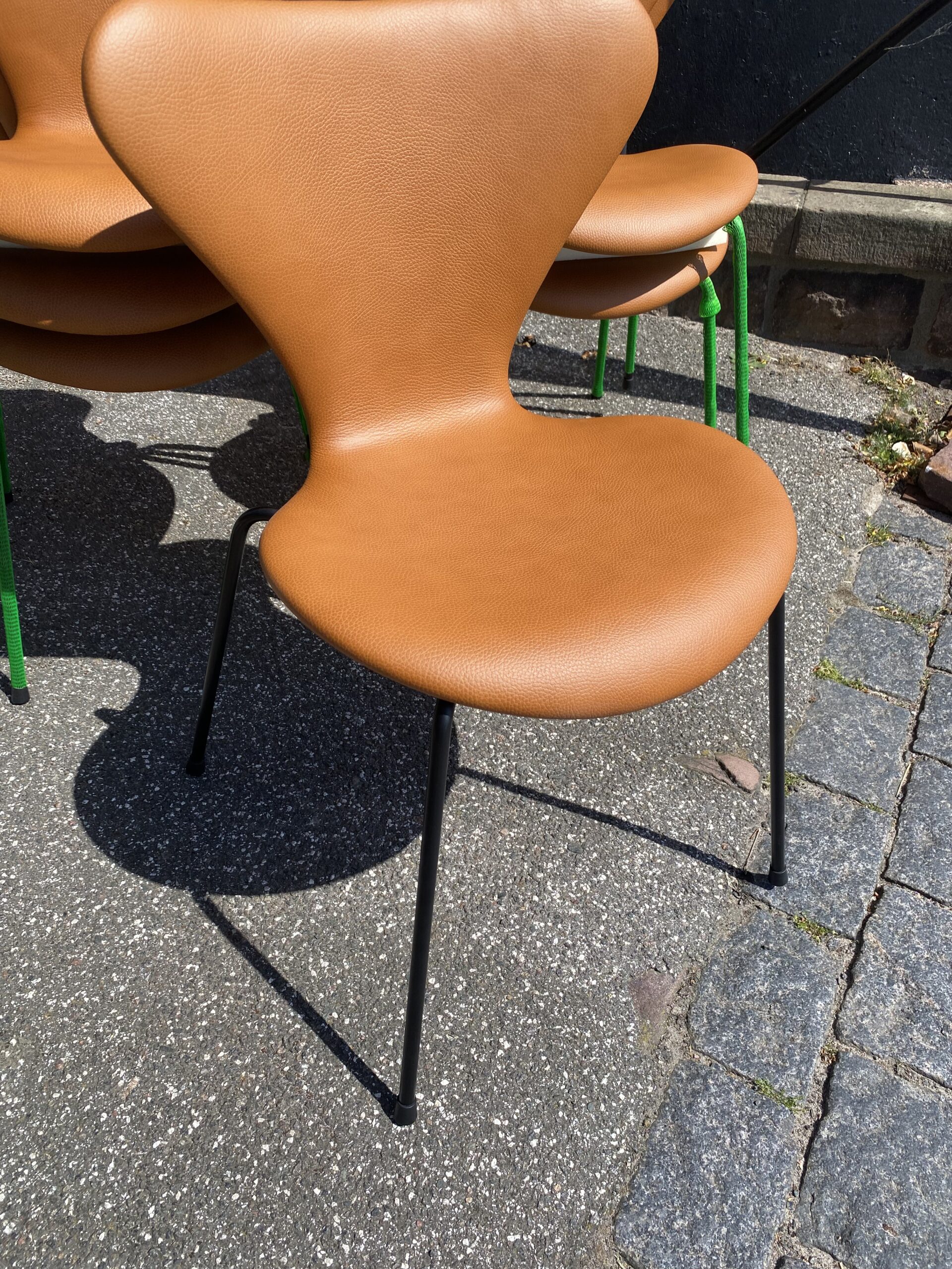 Arne Jacobsen stole, model 3107 Nypolsret i calvado læder og benforhøjet til nyere højde. Stel er nylakeret i sort.