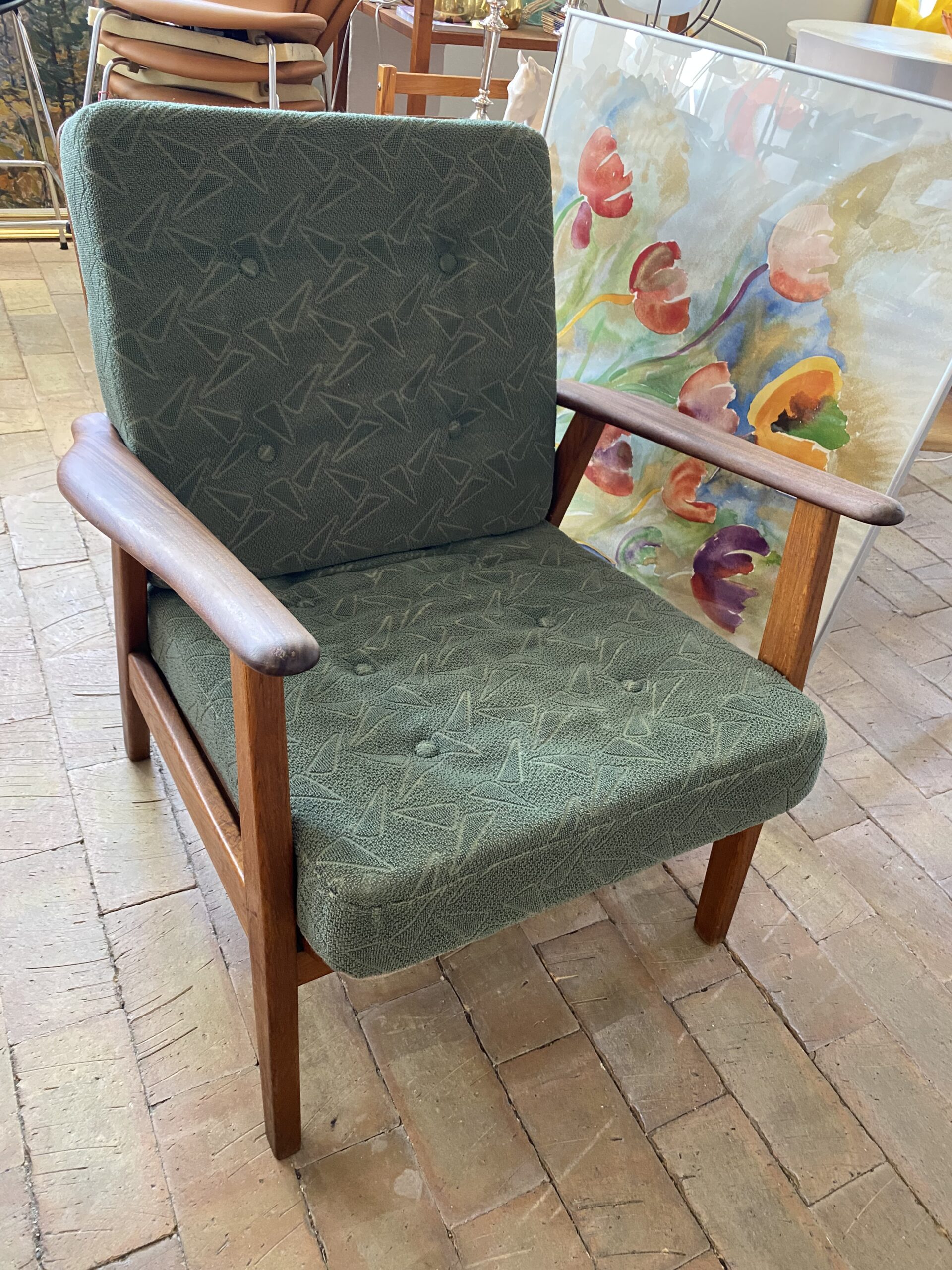 Lænestol udført i teaktræ, polstret i grønt stof.