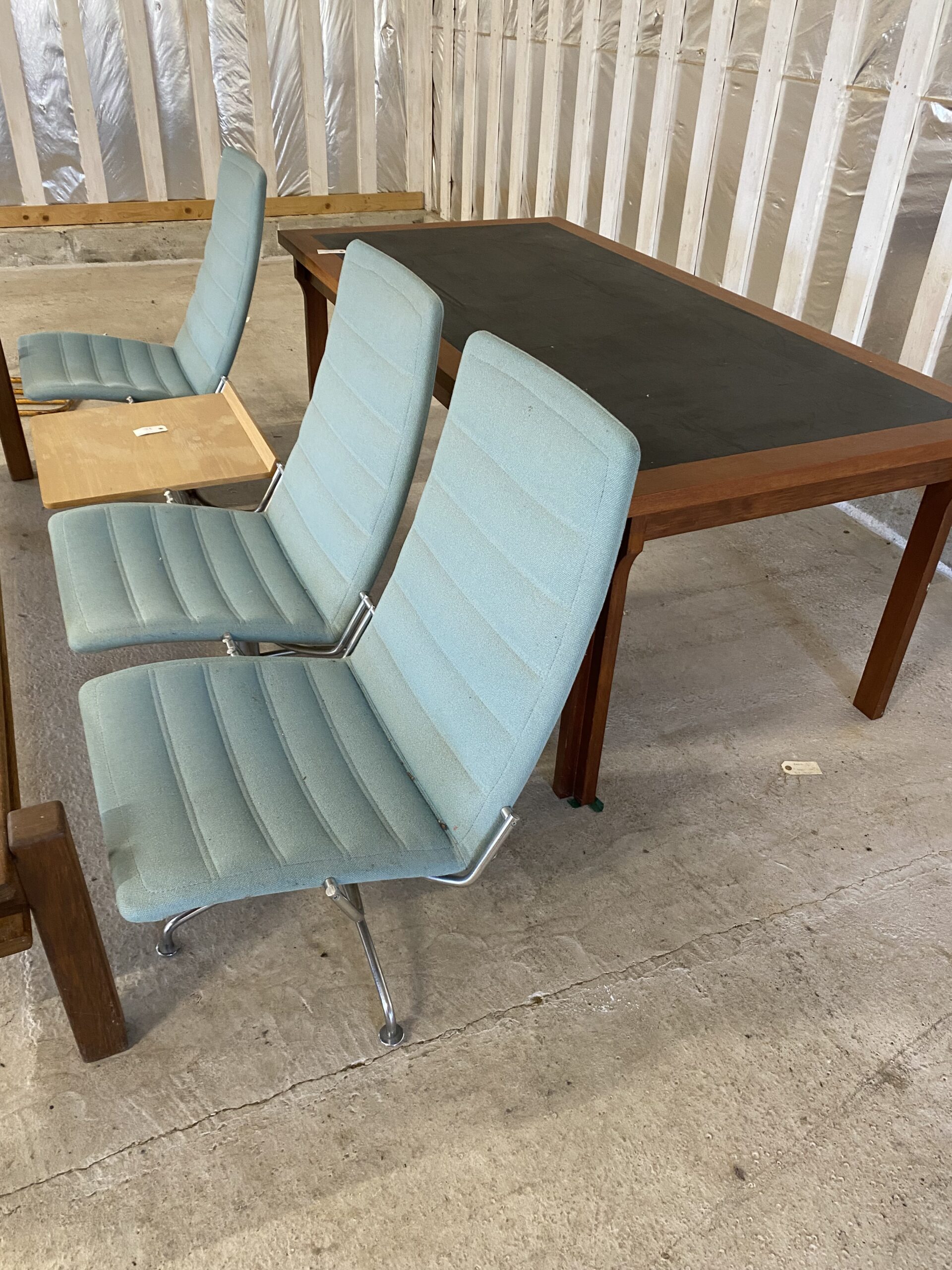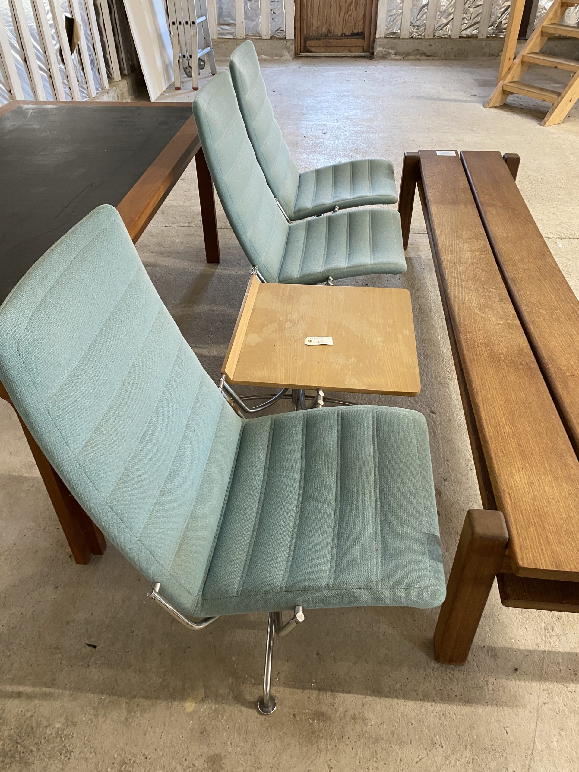 Lufthavnsofa med grønligt stof, stel i forkromet metal.