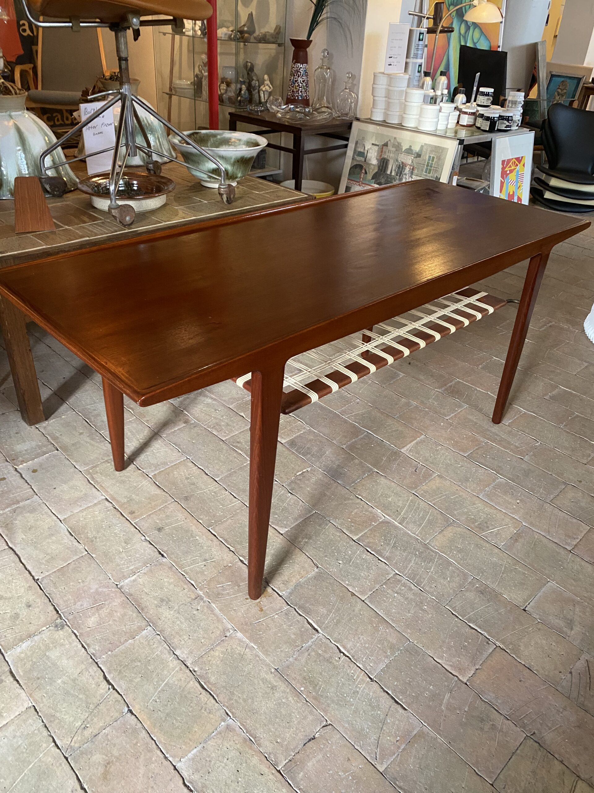 Teak Sofabord med Kehlet kant, hylde under.